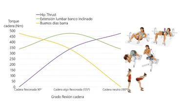 En la siguiente imagen, adaptada de Bret Contreras, puedes ver los perfiles de resistencia de tres ejercicios de extensión de cadera.