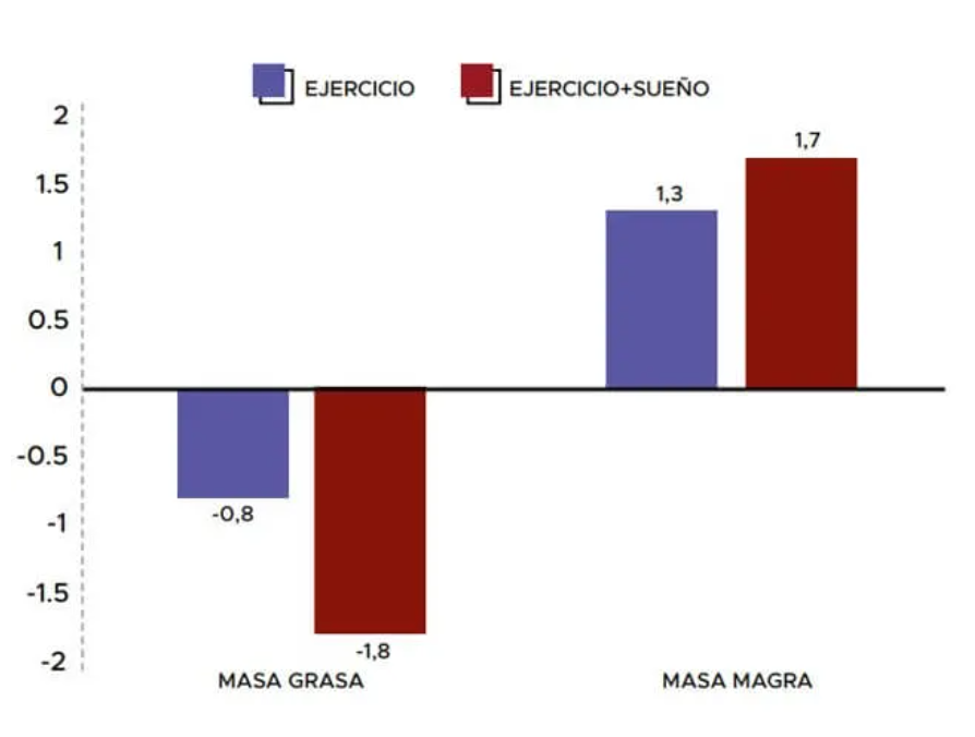 Lo que revela la gráfica es claro: las personas que redujeron su tiempo de descanso no solo experimentaron peores resultados, sino que perdieron el doble de masa magra en comparación con quienes descansaban adecuadamente. Además, su pérdida de grasa corporal fue prácticamente la mitad que la de aquellos que mantenían un buen descanso. Estos datos refuerzan la idea de que un sueño insuficiente no solo dificulta la ganancia de masa muscular, sino que también compromete los esfuerzos de pérdida de grasa, disminuyendo los beneficios de una buena alimentación y un entrenamiento adecuado.