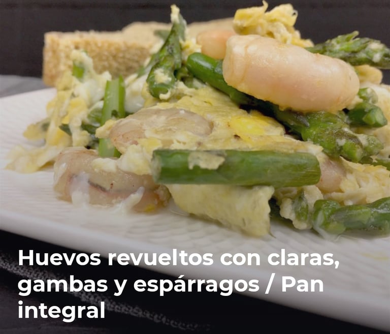 HUEVOS REVUELTOS CON CLARAS, GAMBAS Y ESPARRAGOS